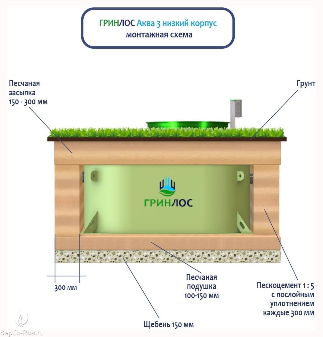 Перед непосредственным монтажом ГРИНЛОС Аква 3 низкий корпус специалисты осуществляют подготовку котлована. Его размеры определяются конструктивными особенностями выбранной модели оборудования.