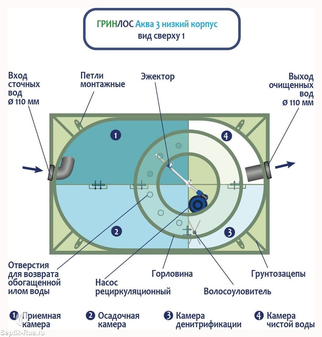 ГРИНЛОС Аква 3 низкий корпус изготавливаются из полипропилена чешского производства. Нижний уровень разделен на четыре отсека со специальными технологическими переливами. Перетекая из одного отстойника в другой, стоки проходят первоначальный процесс отстаивания, усреднения стоков, отделения нерастворимых фракций (жиров и т.д.), которые остаются в первом отсеке. При этом уже в первом отсеке начинается очистка стоков свободным активным илом. Затем, из третьего отсека, стоки посредством дренажного насоса подаются на верхний уровень, на специальный разбрызгиватель, через который происходит орошение биофильтра.